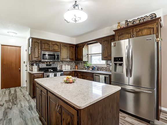 The perfect home, a limestone ranch with finished walkout basement on over 3/4 acre lot plus a second detached garage! Located in Eisenhower Elementary school district and only a short commute there and to town conveniences. This spacious ranch offers numerous updates throughout beginning at the welcoming living room with gas log fireplace and nearby dining area kitchen. Ample cabinetry, upgraded stainless appliances and laminate flooring displayed here. Main level offers three bedrooms and just off the dining area, access to the backyard deck overlooking the yard. Make the most of entertaining or overnight guests at the finished basement with guest room and kitchenette! Schedule your private tour today!