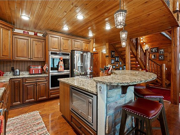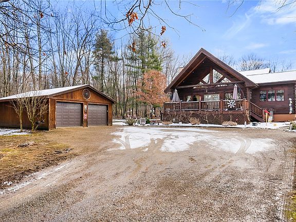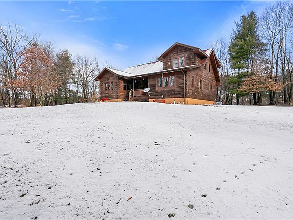 Welcome to this custom built, log home. This home is adorned with wood everywhere from the beams to the floors. Walk in the front door to a beautiful entry and then head to the open concept great room with wood burning fireplace and beautiful, high ceilings. The kitchen has a copper sink, granite countertops, built in wall ovens, and plenty of counter space. There is an additional room that was originally the dining room, currently being used as a sunroom. There is a half bath and lots of pantry space. The main floor also boasts a first floor master suite with walk in closets, laundry area, and a wonderful master bathroom. Upstairs you will find a loft, another full bathroom and two additional bedrooms. The basement is fully finished with plenty of storage and room for entertaining. There is another half bath too. There is a 2 car detached grge and a long private drive. There is a covered front porch and a nice back deck overlooking the property. Lots of outdoor space and privacy.