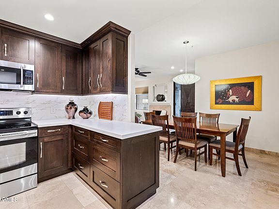 Light, bright and professionally remodeled thru-out. Sharpest home in Villages North. Ground level, 1 story unit with no steps in highly desirable gated community. Two big spacious bedrooms PLUS a large Den which could be 3rd bedroom. Beautiful polished travertine floors as well as all baths/showers are travertine stone. Gorgeous new custom cabinets in kitchen from floor all the way up to the ceiling, Pull outs, soft close and new Quartz Countertops. Both A/C units replaced new within last year; new Hot water heater & new Washer & Dryer. Perfect master split floor plan which gives both you and your guests privacy. 3 community pools/spas heated all year round plus tennis courts. Walking paths w/easy access to Safeway, AJ's and cool restaurants. HOA includes