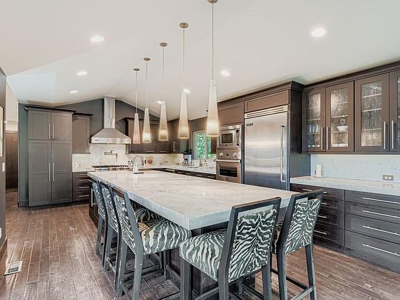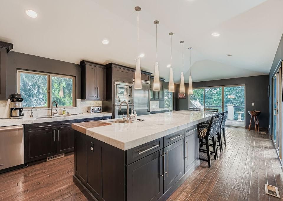 The chef's kitchen with viking appliances and oversized island flows seamlessly into a formal Living and Dining room that boasts the open living concept, ideal for hosting guests or enjoying a quiet evening in. Downstairs, an additional living room offers a relaxed setting for gatherings, movie nights, or separate entertaining space.