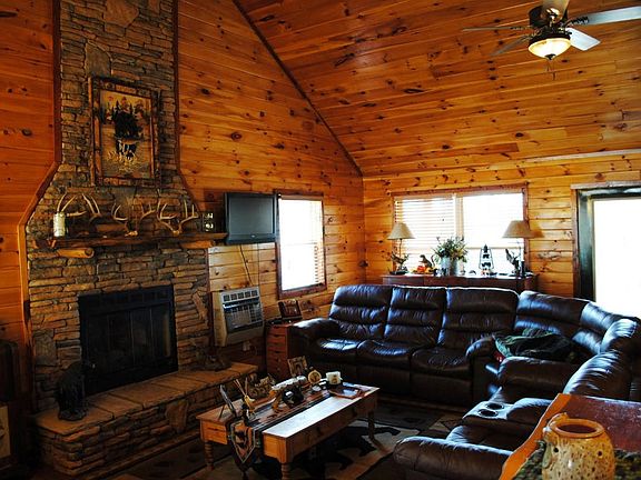 Log cabin style with a loft. Open floor space. Covered porches length of the house in the front and back. Pine tongue and groove walls through out the house. Cedar cabinets and staircase. Fire place in center of living space. Ceilings are pine tongue and groove and are vaulted. Ceiling fans throughout the house. Has a rustic decor. Storm shelter and above ground pool.