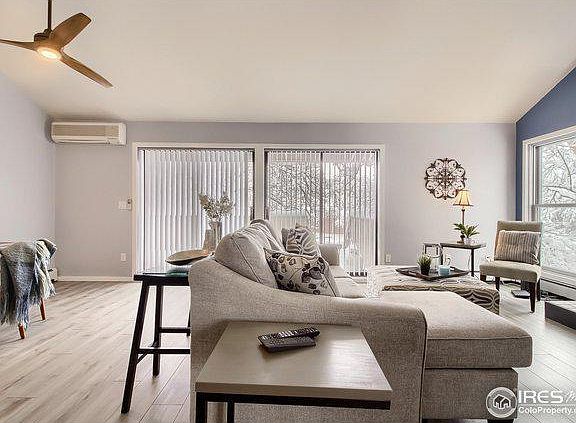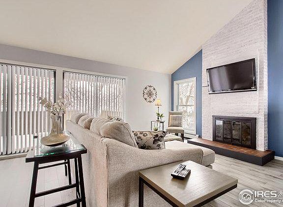 Fabulous & colorful END UNIT in private/quiet neighborhood close to 29th St. mall, near Transit Village & Boulder Community Hospital. Jump on bike path or shoot out of town in minutes with this exceptional location.Great room feel, open & vaulted, sizable galley-style kitchen w/ stainless steel appliances, living & master bedroom fireplace. beautiful engineered laminate wide plank flooring, AC, cooler lower level bedrooms in summer, upper windows replaced, tree-covered east-facing deck, 1- car garage PLUS CARPORT, plenty of storage & workshop/bench in garage, conveniently located adjacent to guest parking for visitors . Feels like a house without the price! . Great entry-level home/investment. Financing like single family.