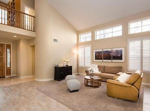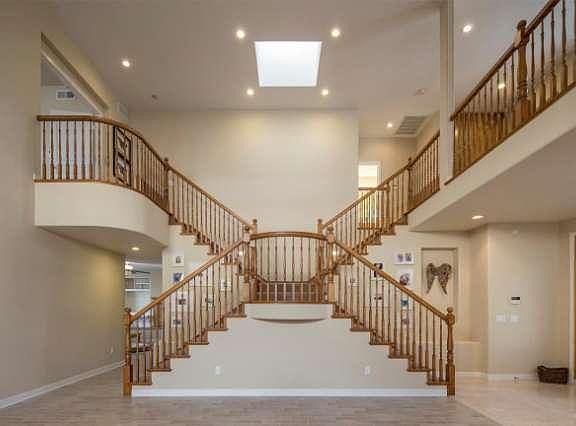Freshly painted and with new carpet, this 5 bedroom, 4.5 bath plus loft with distinctive split staircase, is priced to move and move in ready! The first thing you'll notice is the split 3 car garage and gorgeous Ficus tree in between. The dramatic carved entry doors greets you and as you enter the soaring ceilings take your breath away. With more than 3400 SF this home is as large as it is elegant. Amenities include plantation shutters, solid raised panel maple cabinets, granite counters, stainless double ovens, Viking 5 burner gas cooktop and built in microwave. Green features include central vacuum, dual zone heat and air, recirculating hot water pump and Milgard dual pane windows. The unique design of the scissor staircase creates two distinct wings: The master bedroom is enormous and has dual walk in closets and a marble fireplace and the bedroom wing, with 3 beds, 2 baths and a loft. The rear yard even has a built in BBQ, rock waterfall and peek-a-boo views. Wow. Updated/Remodeled