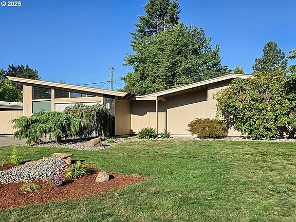 Own a legacy. Live the architecture. Where art meets everyday living: this 1955 Mid-Century Modern gem—designed by the legendary John Storrs—is available to the public for the first time since 1955. A rare opportunity to own a masterful design that blends timeless form with livable function, all on a serene corner lot in a well-established Northeast neighborhood. Step inside, and you’ll immediately feel that harmony. Natural light pours through large original wood-framed windows and multiple skylights, highlighting the warm Hemlock wall paneling and recently refinished solid bamboo flooring. The open, post-and-beam layout allows for an easy flow of energy and movement, making daily living feel both grounded and inspired. Thoughtfully refreshed to honor Storrs’ original design while enhancing comfort and livability: new interior and exterior paint; new wall-to-wall carpet in bedrooms; remodeled bathroom with bamboo-style tile, low-barrier shower, updated vanity, and retro honeycomb flooring; high vaulted ceilings; wood-burning fireplace; stainless-steel appliances with Viking gas range and new disposer, stainless steel cabinetry below and bamboo veneer cabinets above the granite counter top; abundant built-ins, efficient use of space; newer (2 years old) architectural shingle roof with all-new sheathing. The extraordinary 4-car oversized garage, designed in 2009 by Greg Hanken, echoes the home's architectural language satisfying just as much car as quality construction enthusiasts. High vaulted ceiling; 8"-deep exposed aggregate floors; extra-thick footings; insulated 2x6 walls; premium lighting; ceiling fans; Milgard dual-panel windows; wall-mounted shop heat; dedicated electric panel, and newer architectural shingle roof. Backyard features a koi pond, a matching tool shed, and a new fence. Besides Storrs' public work, his designs command premium value to collectors and those seeking architectural significance and a connection to Portland's architectural legacy. [Home Energy Score = 1. HES Report at https://rpt.greenbuildingregistry.com/hes/OR10239654]