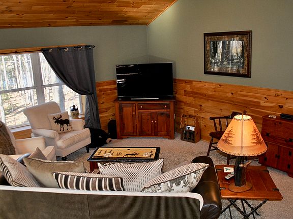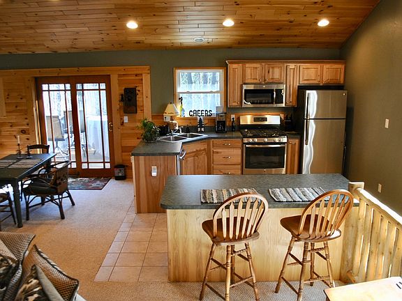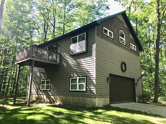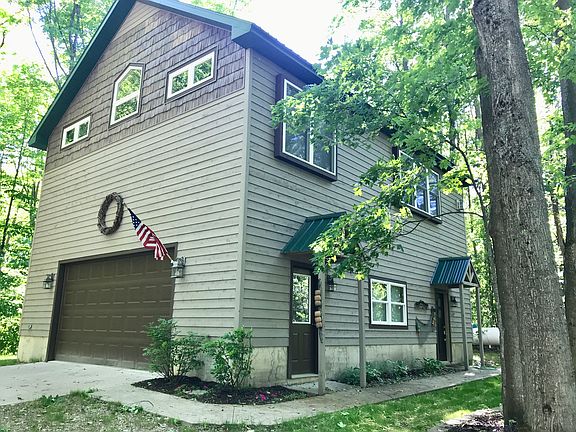 Recently updated 2 bedroom 1.5 bath residence above a 2.5 car garage! T&G vaulted ceiling, gas stove, new bathroom granite countertop and fixtures, new stainless steel appliances in open kitchen/great room, new Hunter Douglas blinds, deck overlooking wooded private setting on approx. 2 acres. Vacant lakefront lot across street also available.