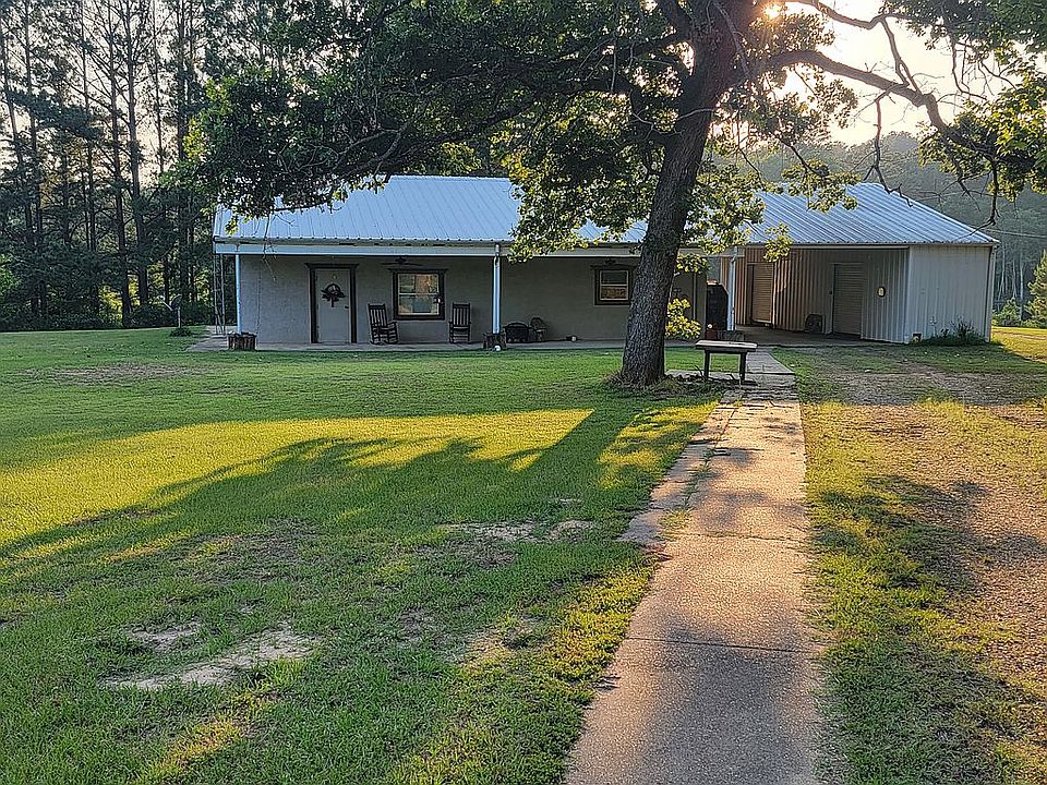 This cinder block home with stucco finished exterior and textured wall interior has the coziest open flowing floor plan as any new construction. It has custom cabinets with granite counter tops in the kitchen with a great bar for a buffet area when family comes. The walk in pantry is every chefs dream. Walking in from the carport, the "mudroom" hall is the place for shoes and jackets then the on to the large utility room with lots of cabinets, a sink and a place to hang laundry. The 2 large bedrooms finish off this wonderful home with a bathroom between them that has a 6 foot marble bath with marble surround. Custom cabinets with linen and a marble countertop. Nothing about this home is plain jane. It was built with love. The land is 27 acres of FUN! The pond has large mouth bass, perch, and catfish. In the very back is a small mountain that you drive up on and can see for miles! A perfect place for a gazebo or just to go be amazed by the view!