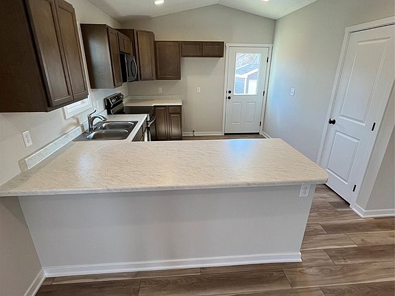 Enjoy LVP flooring throughout the kitchen and living area, highlighted by vaulted ceilings that enhance the open feel. The kitchen features rich maple cabinetry, stainless steel GE appliances, a pantry, and a breakfast bar—perfect for casual meals or entertaining.