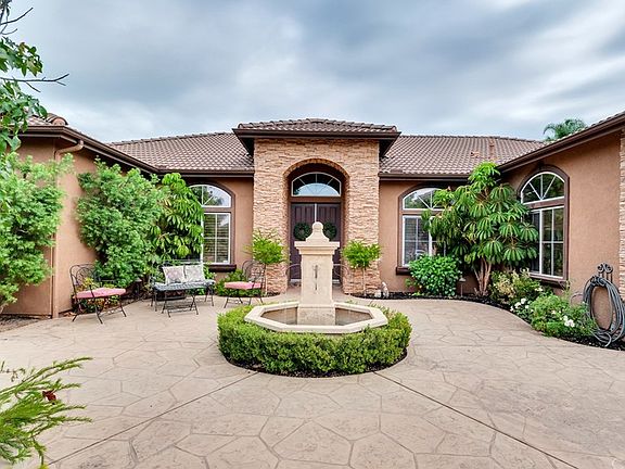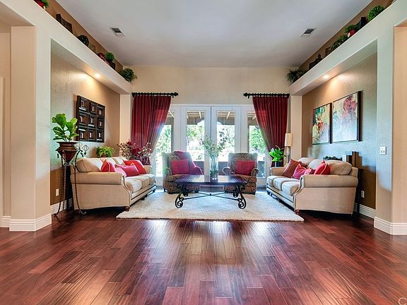 TURN KEY Gorgeous Custom Ranch Style Home. Elegant Curb Appeal with stairs leading you pass beautiful fountain to your double door entry, decorative stone throughout the exterior. This home has it all walk into your formal living room with luxurious wood floor through out the home. Offering 4 bedrooms and 2.5 bathrooms. Spacious Master bedroom with walk in closet, french doors open to your private backyard. Master bathroom with dual sinks, separate shower and tub. Three oversize bedrooms with wood flooring. A bonus room that can be used for an office or converted to another bedroom. Large formal dinning room for entertaining. Gourmet Kitchen with granite counters and lots of cabinets for storage, including a pantry. Stove top with built in microwave. Kitchen open to spacious family room with beautiful fireplace, french doors open up to your tropical back yard with oversize covered patio with a grassy area including mature orange trees and professional landscaping plenty of room for entertaining, their is enough room to add a pool/spa making it your very own resort. Corner lot and a cul-d-sac making this home very peaceful and secluded. Three Car Garage with RV Access located on either side of home. Located in a very desirable area. Highly rated schools nearby. Shopping and freeways with-in miles.