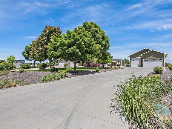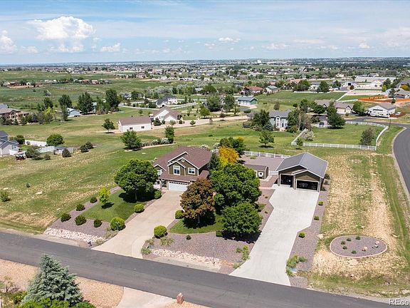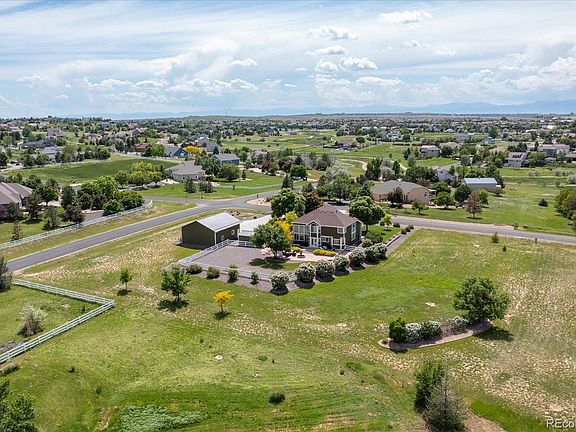 Get excited about this house that has something for everyone in highly desirable Todd Creek Farms. Let's start outdoors where you have magnificent views of the Front Range from your front porch. You have over 1.8 acres of land, fully irrigated with much of it landscaped with a beautiful lawn, many trees, and entertaining in the summers will be cool on your east-side back patio. There is a six-car, 1280-square-foot detached garage with a metal roof, a swamp cooler, and both a 10-foot and an 8-foot door for all of your vehicle and storage needs. Long concrete driveways for both attached 3-car and detached 6-car garages and an additional shed complete the picture.