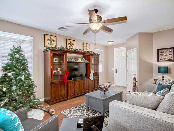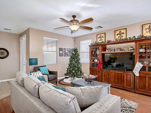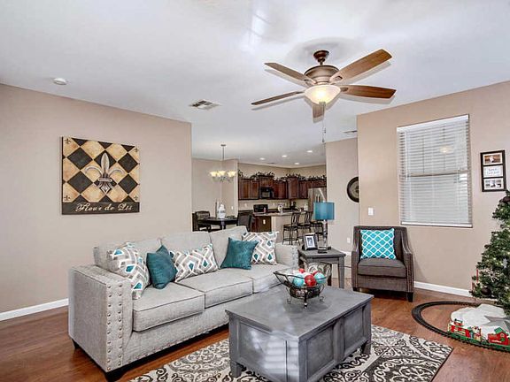 Absolutely Gorgeous Home inside and out. This ''Model'' perfect Home is a must see! Contemporary interior palette, beautiful wood floors in great room/masterbedroom, ceiling fans, upgraded lighting, window blinds, and move-in ready! Stunning eat-in kitchen features center island, corian counters, breakfast bar, black appliances, pantry, and plethora of upgraded wood cabinetry with hardware. Great gathering place for family and friends. Plush neutral carpet in two bedrooms with plenty of closets. Charming backyard boasts covered paver patio and BBQ area. Community Clubhouse, Pool, Heated Spa, and Playground.