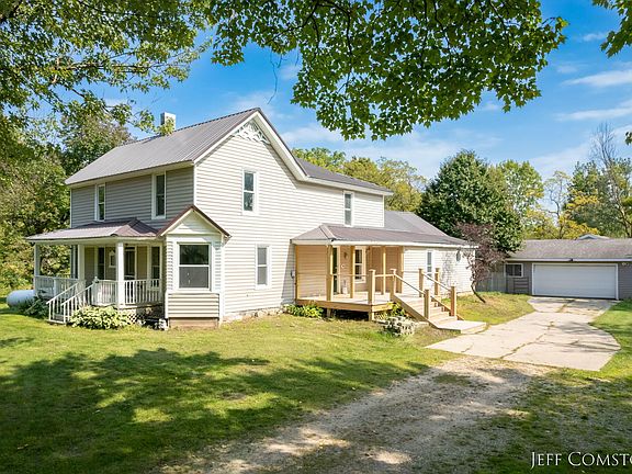 Farmhouse Living at its best with features for all tastes. This 5-bedroom, 2.5-bathroom, 2,768 square foot home is a true gem located in the center of 3.99 Acres! 5th bedroom needs some finishing touches.The spacious interior includes multiple living areas, a kitchen with a large island, and a main floor primary suite for ultimate comfort. Step outside to your own outdoor oasis featuring large decks with a 27' round above-ground pool and a massive, detached 4+ car garage with ample space for a workshop and 'toy' storage. Enjoy peaceful moments on the front and side porches while taking in the picturesque country views with mature trees and a pond. Don't miss this rare opportunity for a perfect blend of functionality, and natural beauty! Only a 30-minute drive to down town Grand Rapids.