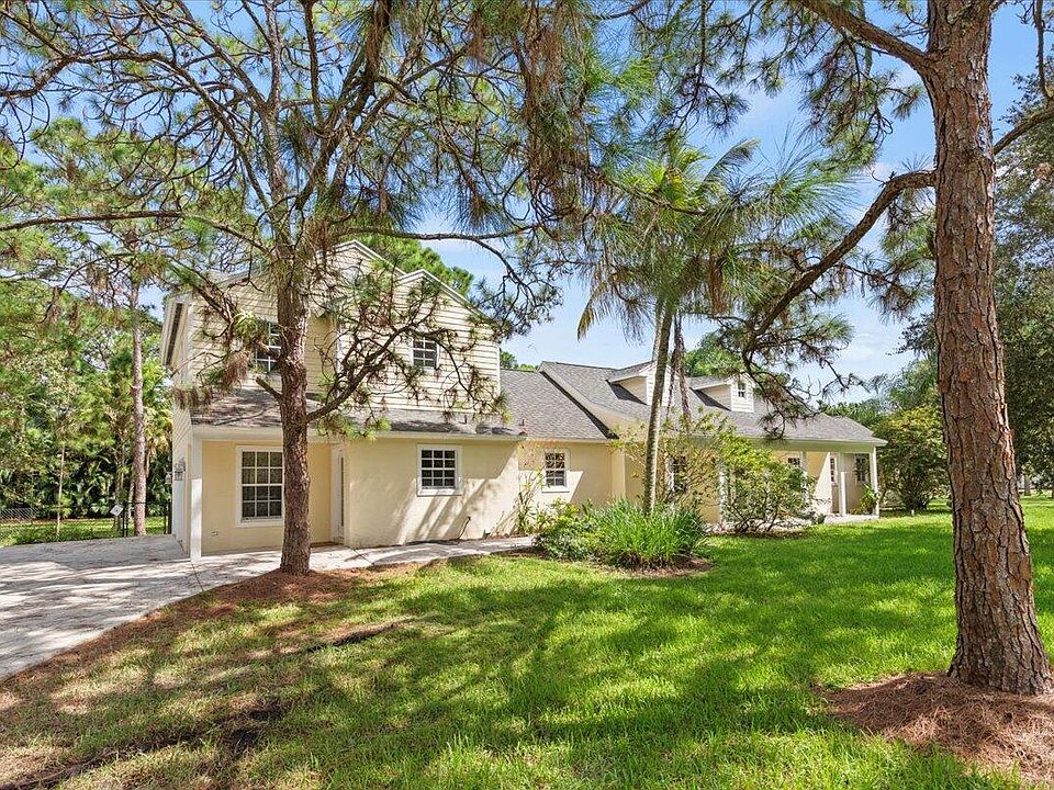Two story house 4 bedroom/ 3 bath CONTEMPORARY HOME WITH 1.15 ACRES in the highly desired Palm Beach Country estates. Only 7.5 miles from the beach, this home conveniently features a very Spacious first floor open plan with great natural light and views of english style garden with two master suites on the first floor (perfect for multi-generational families), 2 spacious bedrooms upstairs perfect for children with full bath. Huge back yard with privacy ideal for a pool and/or guest house. Screened Patio, whole house wifi, security cameras, updated kitchen, laundry room, with city and well water, attached 2 car garage, No HOA, new shopping plaza, A-rated schools.... This home will go quickly!