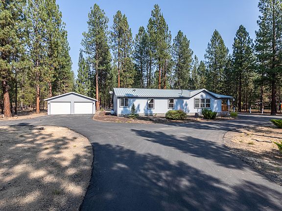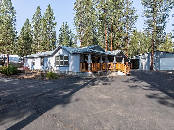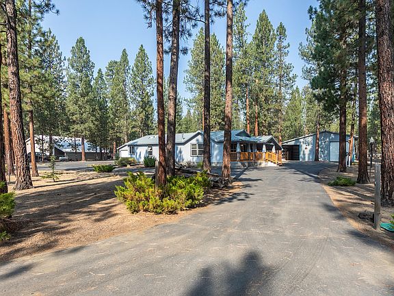 Looking for a great spot to access all that Central Oregon has to offer & still feel like you are in a beautiful natural setting? Look no further than this flat .93 acre-lot located amongst gorgeous tall pines in the popular Ponderosa Pines neighborhood. This 2007-built manufactured home is situated on the paved road & features 1620 SF of comfortable living space including an en-suite master, kitchen with breakfast bar, island & new stainless appliances including gas range, eat-in area, new cozy gas stove in family room and a mud/laundry/utility room. Huge shop with RV parking & hookup, full bath & utility sink & a detached 2-car garage offer loads of storage for all your toys. Garden shed & enclosed dog run (located within the fully fenced backyard) round out the extra features to maximize outdoor enjoyment. Ride your ATV or bike from the adjoining community space located behind back gates on property. Located close to Wickiup & Crane Prairie Reservoirs + Mt. Bachelor!