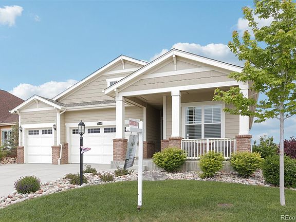 This gorgeous Ranch smart home offers 2 homes in one. The fully finished walk-out basement has it's own kitchen, family room, laundry, primary bedroom/ bath, and much more. This gorgeous home ideally faces the 16th hole Todd Creek Golf Course (no homes blocking view) and backs to a reservoir. This lot that backs to water is almost impossible to find (you must see the photos). The main level offers 9' ceilings, open floorplan, beautiful kitchen, huge primary bedroom, dream bathroom, and much more. Located in the highly sought after resort-style gated community of Heritage Todd Creek. This amazing neighborhood is for active adults ages 55 & up, offering many amenities including restaurant, clubhouse, golf course, fitness center, sport courts, indoor and outdoor swimming pools as well as pickleball, educational opportunities, social gatherings and clubs. Quick easy access to E470, 20 minutes from DIA, and 30 min to downtown Denver. Huge incentive when using preferred lender. This home won't last long.