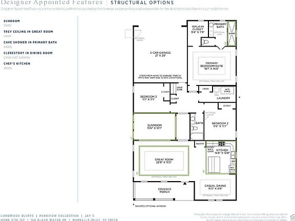 Home is currently under construction with estimated completion Spring of 2023! This Jay plan offers a spacious covered front porch that overlooks the greenway park. The well-designed chef's kitchen is equipped with breakfast bar, plenty of counter space, stainless steel natural gas cooktop and wall oven, quartz countertops, tile backsplash and sizable pantry. Adjacent to the kitchen is a casual dining space with ample natural light. The gorgeous primary bedroom suite features generously sized walk-in closet, spa-like primary bath with a large tiled cave shower, and private water closet. Additional highlights include a sunroom, Revwood, carpet and tile flooring, and dramatic double tray ceilings in the great room. Longwood Bluffs at Prince Creek offers exceptional community amenities within walking distance including a TPC Golf Course, pools, tennis courts, nature trails, biking trails, playgrounds, and just 3 miles to Murrells Inlet Marshwalk and only 5 miles to the beach!
