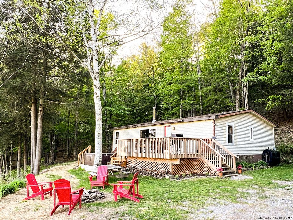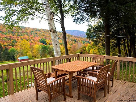 At the edge of the woods overlooking a picturesque Catskills tableau of meadow and mountains, Mountain Cottage is not only a pleasing home, but an incredible investment property. Only 3.5 miles from Belleayre Ski Mountain / Beach, it generated $49k in rental income in 2022 with very low overhead, making this property a worthy contender whether for your own use or as an income source. The cottage, which is the last along a dead end road, has a spacious deck with spots for grilling, dining, lounging, and hanging in the hot tub. The separate fire pit enjoys killer views. The living room is an inviting space with a picture window that perfectly frames the stunning views, while the pellet stove adds a touch of “cabin-in-the-woods” charm. The kitchen is equipped with all the key features for hassle-free meal prep and has a dedicated dining area. The primary suite includes a spacious bedroom and a bath that features a tub and shower combination, while the 2 addl BRs are equally inviting, with plenty of natural light. The second bathroom also includes a tub/shower. Handy laundry room, new septic, new furnace.