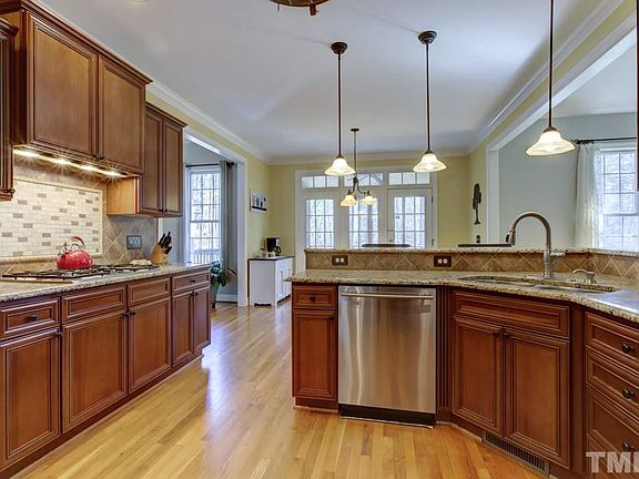 4 bdrm, 4 bath home on 2.89 acres of serene landscaped & wooded area. 9 ft ceiling. Cathedral ceiling in family Rm. Impressive gourmet kitchen, granite, stainless. Tile back splash/kick plate. Keeping rm w/fireplace & built-in shelving. Bonus rm, flex space. Hardwoods. Formal dining. Water softener/filtration. Screened porch, huge deck beautiful views! Long private circular drive-way. Yard partially fenced. shed, walk-in crawl. Peaceful North location w/convenient access to Carrboro & Chapel Hill.