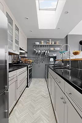 154 Clinton is a self-managed, 5-unit co-op located between Livingston and Schermerhorn Streets. This 25 ft wide brick townhouse in Brooklyn Heights offers a beautiful 1 Bedroom, 1 Bath with private roof garden and deluxe outdoor kitchen. This home has been mentioned in Elle Decor, Aspire Design and Home, House Beautiful Open House Live, Sotheby's Intl--just to name a few. With a wall of windows, the living room is flooded with Western light and views of the city skyline. Walnut-stained hardwood floors throughout. The living room features a working pot-belly fireplace, perfect for staying cozy in the NYC winters. The galley kitchen is custom designed with abundant storage, herringbone marble floors, Miele dishwasher, a Fisher Paykel fridge, a gas range, granite counters, and a skylight. Recently renovated, the custom bath has new plumbing and electrical, Calacutta Cielo Marble, radiant heat Porcelanosa tile floors, Newport brass fixtures and towel warmer, custom shelving, a mirrored wall, and skylight. washer/dryer in unit. The spacious bedroom is bathed in light from a wall of windows. Replete with built-in drawers and bookcases, three closets, and a feature wall of hand-painted Japanese rice paper by Porter Teleo complete this room. Enjoy your year-round oasis--a custom-designed and landscaped roof garden with panoramic views of lower Manhattan and Brooklyn. IPE/Stone Roof deck built on steel beams, landscaped with irrigation system and retractable hose, custom SS pergola, and surrounded by mature birch trees, wildflowers, ornamental grasses, and herb and vegetable gardens. The roof deck is also made to entertain with a custom stainless-steel kitchen and wraparound custom banquette, custom dining table with built-in wine trough, WiFi, and wired lights throughout to keep the night young. Excellent location to major transportation (the 2/3/4/5/A/C/F/G and R trains) and a short distance from the Brooklyn Promenade, Brooklyn Bridge Park, the NYC Ferry, many playgrounds, and the restaurant and shopping districts of neighboring Cobble Hill and Boerum Hill. Assigned storage in the basement included.