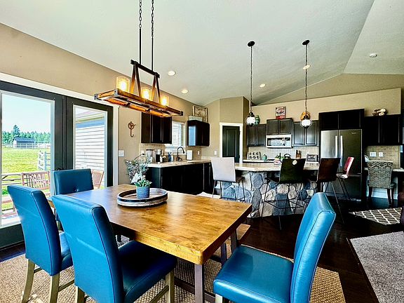 Located just outside of Columbia Falls, Montana, this home is nestled at the base of the north end of the Swan Range Mountains. This fully furnished rustic modern farmhouse is pet and family friendly featuring stunning panoramic mountain views right out the front door. A doggy door is accessible to the fully fenced garage directly from the home through the attached garage.