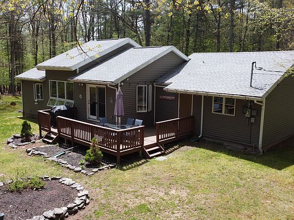 The Lakey Retreat! This meticulously updated ranch home offers the perfect blend of privacy and convenience. Spread out on 3.34 acres of your own personal paradise, with NO HOA restrictions to cramp your style! Escape the everyday hustle and bustle and come home to peace and serenity. Prime Location: Just a short distance (less than a mile!) to the shores of Lake Wallenpaupack, offering endless opportunities for water recreation. This home comes ''turn-key'' - simply unpack and start enjoying your new life! Unwind in your private Primary Suite, complete with dual walk-in closets and bathroom.The cathedral ceiling living room with expansive windows boasts a light and airy feel, perfect for gatherings. Step out onto your expansive back deck and take in the beauty of your sprawling backyard with fire pit - ideal for barbeques, stargazing, or simply soaking up the fresh air. Stainless steel appliances and a partially finished basement (with the potential for two additional bedrooms) provide all the modern conveniences you desire. A two-car garage and a wrap-around paved driveway offer plenty of parking space, while the utility shed provides additional storage for all your outdoor gear. Life's better at the lake.
