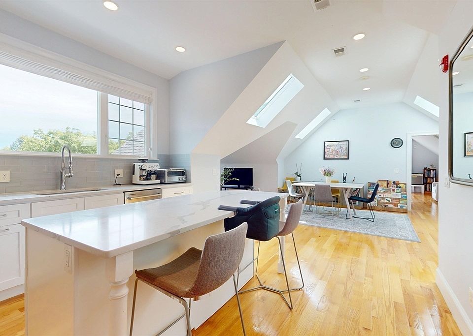 Don't miss this gorgeous sun-drenched penthouse. This stunning completely remodeled 2020 penthouse condo has an open-concept floor plan and soaring cathedral ceilings creating a spacious open feel. This home is flooded with natural light thanks to several oversized windows and five large skylights that illuminate every corner. The gourmet kitchen is built for both everyday living and entertaining. It features a large island, quartz countertops, stainless steel appliances, and a built-in wine fridge. Recessed lighting and beautiful hardwood floors complete the sophisticated look. The luxurious primary suite is a true sanctuary with dramatic 10-foot ceilings, dual closets and a gorgeous en-suite bathroom complete with heated floors. Also includes in-unit laundry, forced hot air, central AC, extra storage, and two deeded parking spots. See video link for details.