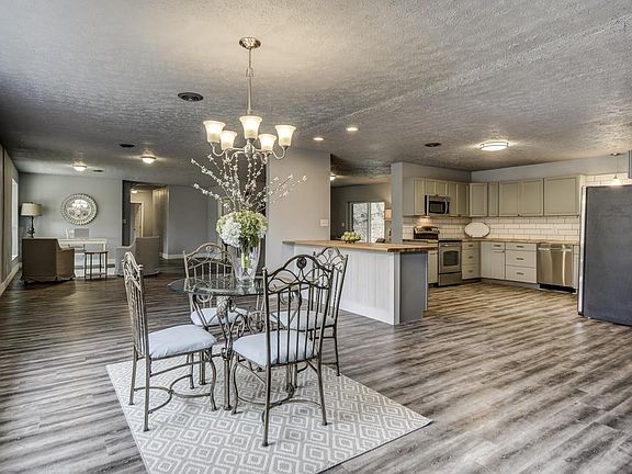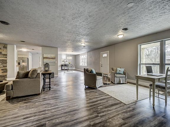 HG TV quality renovation - New paint, flooring, replacement windows throughout. New redesigned kitchen with bar, stainless steel appliances. Opened up plan with combo kitchen, dining, family room and den/office. New baths with walk-in shower. New metal roof and front porch. Private 1.9 acres of woods and a creek with easy access to I 65 .