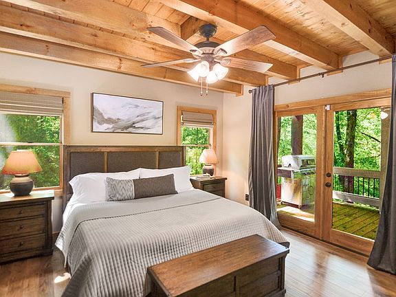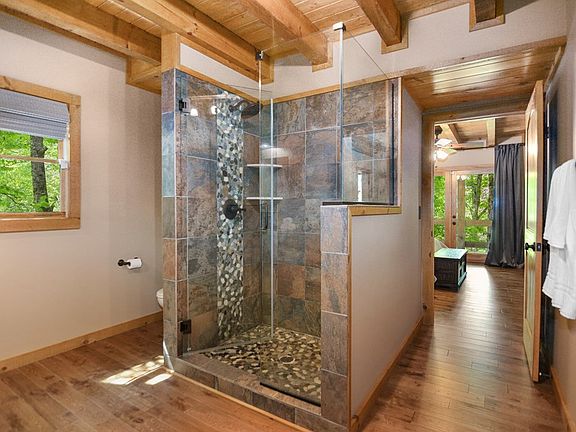 Stunning 4-Bedroom Cabin on Mountaintown Creek! Nestled directly on the trout-filled waters of Mountaintown Creek, this exquisite 4-bedroom, 3.5-bath cabin offers the ultimate mountain escape, located within the gated Coosawattee River Resort, just 6.5 miles from Ellijay's charming shops and restaurants. The cabin's expansive wrap-around covered porches offer incredible views of the rushing creek. Gather around the stacked stone outdoor fireplace or retreat to the private third-story balcony for a quiet moment with nature. Down by the water's edge, a stone fire pit invites you to roast marshmallows while soaking in the peaceful surroundings. The spacious, light-filled great room, featuring floor-to-ceiling windows that perfectly frame the stunning natural setting. The gourmet kitchen boasts granite countertops, custom cabinetry, and a center island that flows seamlessly into the living space. A unique half bath on the main level features beautiful poplar bark accents and a stylish vessel sink. The main-level master suite is a luxurious retreat, offering a custom tile shower, dual vanities, and a private sitting area with stunning creek views. Upstairs, you'll find a loft with a gaming table and two more bedrooms featuring vaulted ceilings and rough sawn accent walls. Rounding out the 2nd level is an upscale bathroom w/ a custom tile shower. The terrace level features a game room, an additional sitting area, the fourth bedroom and full bath. Outdoor enthusiasts will love the creekside location, known for excellent trout fishing. Bring your kayaks, fly rods, and adventurous spirit. After a day of exploring, relax in the hot tub and take in the serene surroundings. With features like a whole-house generator, cell reception boosters, and a perfect mix of wood and sheetrock finishes, this cabin has been designed with comfort, style, and functionality in mind. From stunning beam accents to custom touches throughout, every detail has been carefully considered.
