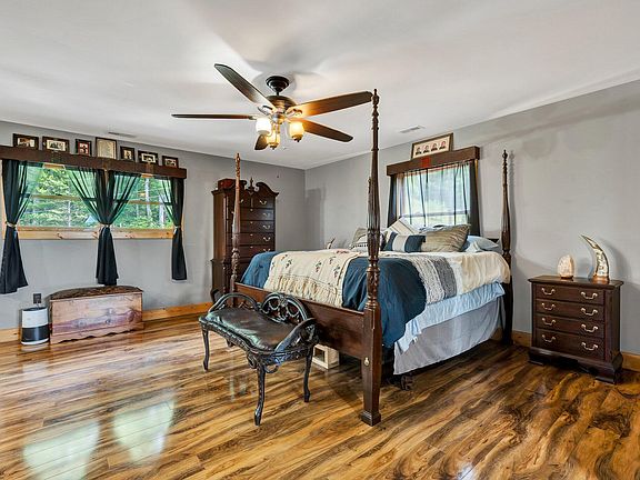 The open-concept living room and kitchen provide the perfect gathering space, highlighted by two fireplaces that create a cozy mountain ambiance. Step outside to the wrap-around porch and take in the peaceful surroundings, or head downstairs to the walk-out basement complete with a wet bar and plenty of room for entertaining. Outdoors, enjoy two gun ranges, a greenhouse, and a small pond, ideal for those who appreciate nature and self-sufficient living.