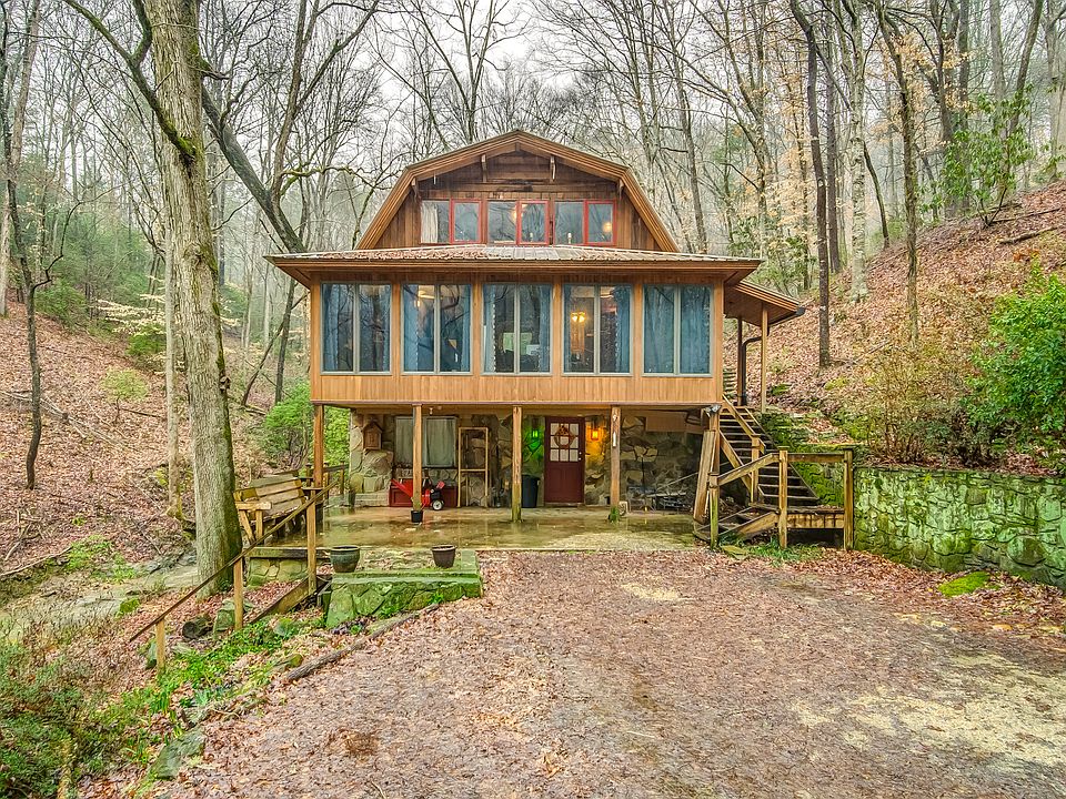 Hide away on 16 beautiful, mountainous acres in Dahlonega. A long and winding driveway leads you down the mountain and home to your private oasis in the woods - a rustic, solid cedar cabin situated creekside in a sunlight-strewn hollow. With two stories plus a daylight basement, the cabin offers three bedrooms and two baths, a southern-facing sunroom, and flagstone fireplace. Outside, a wraparound porch and plenty of space to enjoy the gorgeous setting with massive granite outcroppings, beautiful canopies of generational timber and about a quarter-mile of a raucous creek running through the property. Serene and private, tucked away from the bustle, yet easy access to GA 400, Historic Dahlonega and UNG
