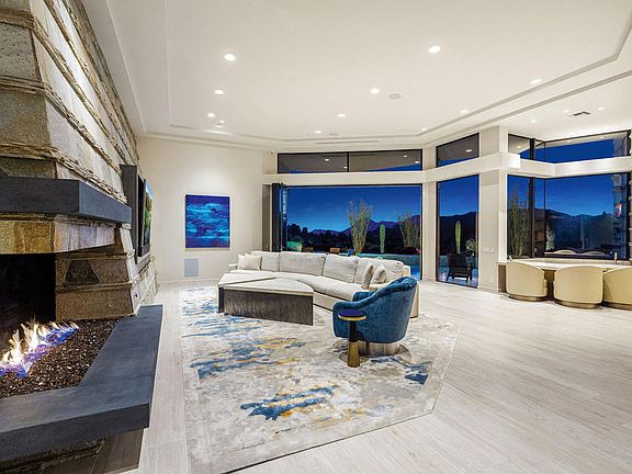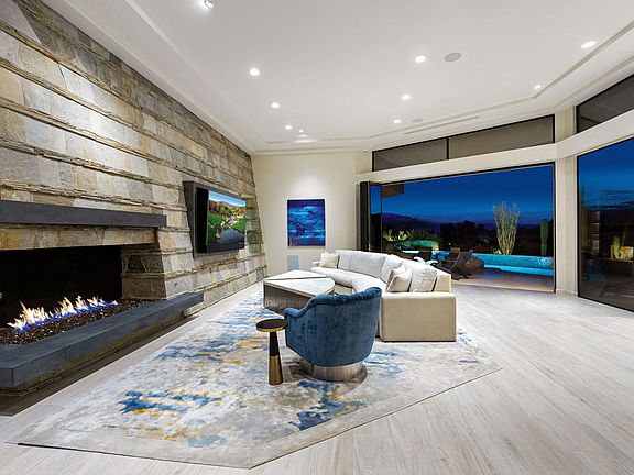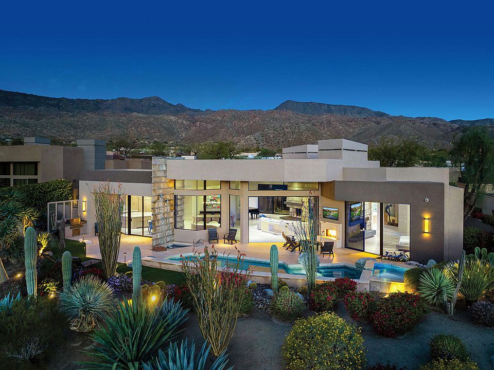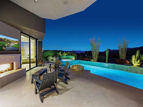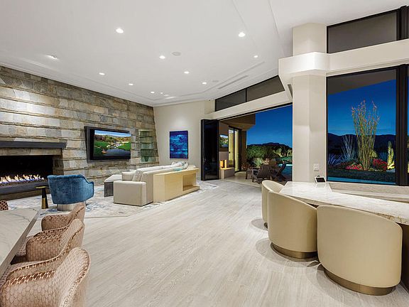 This bright, contemporary home was recently renovated with new flooring, surfaces, appliances, solar and much more. Three bedroom suites inside, of which one is currently furnished as an office. A separate entry guest house includes a wet bar and nicely appointed bath area. Unobstructed views of the 16th fairway and green of BIGHORN'S Mountain Course are enjoyed from the kitchen, great room, wet bar and master suite. Outdoor living includes pool, spa, fireplace, television and built-in BBQ center. Professionally furnished. Owned solar.