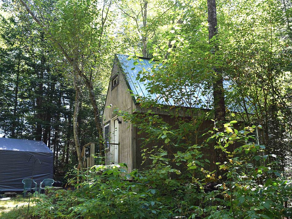Private wooded acresMetal framed storage shelterCustom built campHeated with a woodstoveLofted one bedroomOpen main floor space