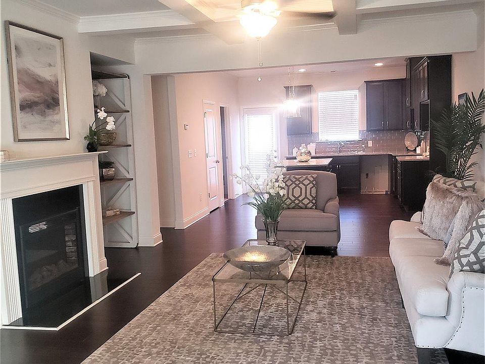 Floorplan called 'Thaxton.' Three Stories. Create a lifestyle in this modern townhome built by Rocklyn Homes. It features a centrally located family room with hardwood floors, coffered ceilings, plus the warmth of a fireplace. Beautiful granite countertops with island and pendent lighting hanging above. Inviting master spa with tile floors, relaxing Garden Tub, separate shower, vanity/ dual sinks, and walk-in closet. Media room/optional office/ bedroom on terrace level. Community offers clubhouse with swim and tennis. LOW HOA fee, covers water/sewer/trash.