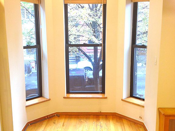Available now is the parlor floor 1bed of a beautiful brownstone in the historic part of Greenpoint. The apartment has been gut renovated but still has lots of character. The kitchen is ideal with a corner island breakfast bar where you can enjoy a meal while looking out your beautiful bay windows. The kitchen has plenty of storage including a built-in wine rack and wine glass holders. The bay windows are looking out at quiet tree-lined noble street. The bedroom is separated from the living room by beautiful French doors and there is an arched transom window too. The bedroom has 2 large windows and an open bathroom with a jacuzzi tub. This can be separated easily by a curtain (curtain rod already installed). There is a half bath in the front part of the apartment off of the living room. The bedroom windows overlook a lovely garden with grape vines. In this tranquil location you will often hear birds chirping when you open the windows. PETS ARE OKHeat & Hot Water included