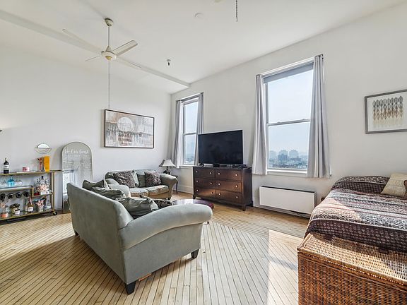 Extraordinary opportunity to own this charming One-bedroom loft-style with parking on a highly coveted block in the Heights! Notable features of this corner unit include panoramic eastern exposure with stunning views of NYC, soaring 17-foot ceilings, oversized windows, and a loft bedroom. The open floor plan encompasses a spacious living room, hardwood flooring, a bonus nook, a full bathroom, and a well-appointed kitchen. Ascend the spiral staircase to unveil a versatile loft area that serves as a full bedroom and provides additional storage space. Pohlmann's Hall, located on Ogden Avenue, holds a prestigious spot on the National Register of Historic Places. Originally constructed in 1874 by a German entrepreneur, it functioned as a social hall, beer garden, and hotel, taking advantage of its breathtaking views of the Hudson River, Manhattan skyline, and even the Statue of Liberty. In the basement, you'll find a room where the beer kegs were once lowered, and a wooden platform at the back of the building was dedicated to dancing. Building amenities include gated parking, a private garden, laundry facility on each floor, additional storage, and bike room. Easy commute to NYC via Light Rail (1 stop connect to Hoboken PATH) and direct buses along Palisade Ave. Close to Palisade and Central Ave redevelopment zones that offer a plethora of chic coffee shops, dining, shopping, and the stunning Riverview Fisk Park with seasonal farmer's market, panoramic NYC views, dog run, day cares, and mini-farm, and basketball courts.
