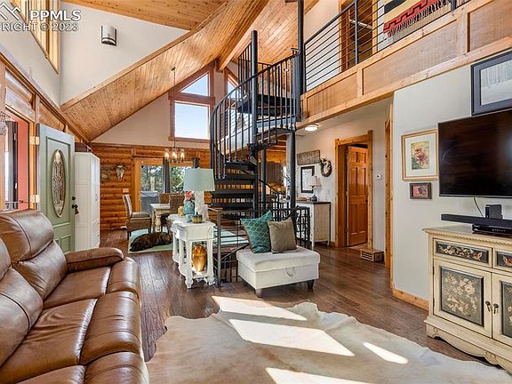 Welcome Home. Perched on its own mountain top, this luxurious log home on close to 10 acres of land is ready for new owners! This gem comes complete with unparalleled panoramic mountain range views, indescribable sunrises and sunsets, and a large full wrap around porch. This well-kept log home extends a contemporary interior. The openconcept 1.5 Story home has been completely renovated in the recent years. The kitchen features gorgeous granite counter tops and lots of cabinet space. The main level master bedroom adjoins to the full bathroom and a stunning spiral staircase connects all three levels. The loft consists of an additional master suite, bathroom and flex room. There is hardwood flooring throughout the main and upper levels. The lower level offers hardwood laminate flooring, and may be utilized as an extension of the main house or as separate living space with its own private entrance. From this space you can enjoy the large newly poured patio and soak in the magnificent views, a large bedroom with plenty of custom closet space, a 3/4 bathroom, a family room, and eat-in kitchenette with granite counter tops. The utility room is large enough to hold the mechanical, radon mitigation system, laundry area, and storage area. The state-of-the-art fully insulated detached garage/shop has 2.5 - 3 bays (depending on usage), ample lighting on its own dedicated fuse panel (110 & 220 amperage capability), dedicated gas heating system, concrete flooring, and side entrance. There is an extra large storage shed with fuse panel, and the exterior/interior lighting accommodates 3 deep freezers. Last but not least, the property has a special lightning prevention system for extra home protection. This home is close to some of the best fishing & hiking around, and approximately an hour away from some amazing Colorado skiing. You won't find another home quite like this one! Call today to reserve your private showing.