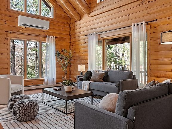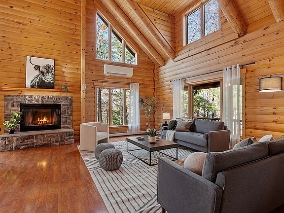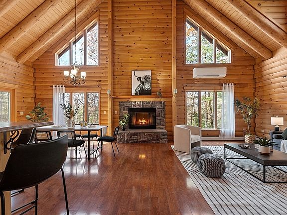 Log homes like this are a rare find. Nestled on a private, wooded lot at the end of a quiet cul-de-sac, this property offers a perfect balance of rustic charm & modern comfort. It’s an entertainer's dream, with both indoor and outdoor spaces designed for gatherings. Inside, the stone fireplace anchors the open-concept living area, with 22ft cathedral ceilings and large windows fill the space with natural light. The kitchen boasts modern appliances & a spacious center island maintaining the warm, cabin-like feel. The first-floor primary suite offers a private retreat with a large ensuite bath & walk-in closet. A half bath & full laundry room complete the main level. Upstairs, there's a cozy loft that overlooks the entire main floor, two additional bedrooms & a full bath. The finished walkout basement includes a workshop & bonus room, perfect for a pool table, game area, or office. Outside the stunning multi-level deck and wraparound stone walkway provide a welcoming outdoor retreat