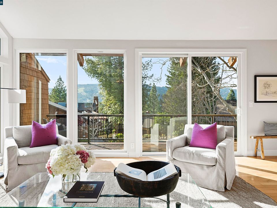 Exceptionally maintained modern townhouse in Orindawoods has all the space and style you could ask for. This 4 bed/3 bath + bonus den home boasts dramatic vaulted ceilings, ample natural light, floor to ceiling windows and views of rolling hillsides. The spacious primary includes soaring ceilings, a show stopper fully remodeled bath, large walk in closet and private deck. The eat-in kitchen is cheery and light filled, complete with quality appliances, recessed lighting and access to a large private deck surrounded by nature. Creature comforts abound with new windows, new siding, 4 zone HVAC and solar panels. Steps to the pool, easy access to year round tennis, courtesy shuttle to BART and use of the clubhouse make this Orindawoods location terrific. You are a stone's throw from downtown and minutes to top rated Orinda schools.