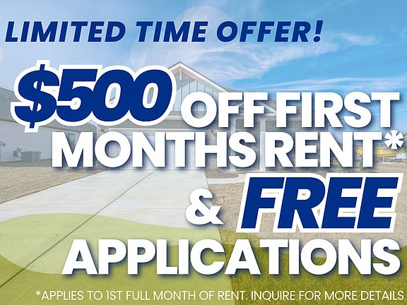 *2 Year Lease - Guaranteed no rent increase on 2nd year! *Pet Friendly *Professionally deep cleaned *Brand new 2024 build *Stainless steel appliances *Quartz countertops *Covered patio Be the FIRST to live in the beautiful brand new construction ranch. The bright and open floorplan features modern LVP floors, recessed lighting, and tons of natural light throughout--great for entertaining. Enjoy cooking in the fabulous kitchen, equipped with stainless steel appliances, quartz countertops, corner walk-in pantry, and large island with bar seating. The primary suite comes with ceiling fan, sizable walk-in closet, and private adjoining bath with dual sinks, glass door shower, and soaking tub. Relax and entertain outdoors on the covered walkout patio. Don't let this one pass you by and schedule your showing today! BEWARE OF SCAMMERS. We DO NOT advertise on Facebook Marketplace or Craigslist, and we will NEVER ask you to wire money or pay in cash. The price listed is based on a 24-month lease for an approved applicant. Prices and special offers are valid for new residents only. All leasing information is believed to be accurate; however, prices and special offers may change without notice and are not guaranteed until the application has been approved. Additional fees may apply, including a lease administration fee, resident benefits package fee, and pet fees (where applicable).
