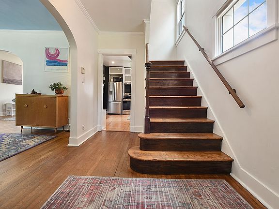 Welcome to a dreamy nest on the desirable and quiet Stanton Ct. Welcome to your charming 4-bedroom home full of warmth and style. The first floor features an inviting living and dining space with large windows and abundant natural light, complemented by a bold, modern color palette. The kitchen shines with white cabinetry, a colorful tile backsplash, and dramatic black walls that make the space feel expansive. Step out onto the spacious covered deck—perfect for summer dinners or morning coffee. The dreamy front porch, recently resurfaced with pebble seal, adds even more charm. Upstairs, find three bedrooms plus a versatile third-floor bonus room. The basement offers high ceilings, a great workspace, and a basement toilet. A truly special home on a quiet street, ready to welcome you in.