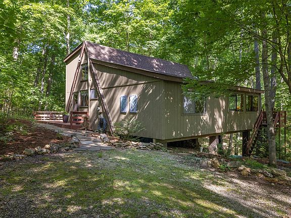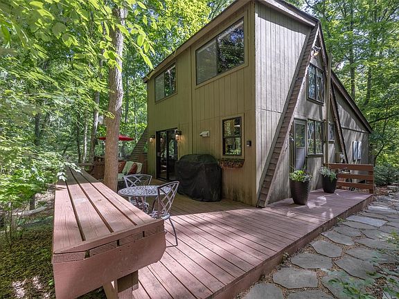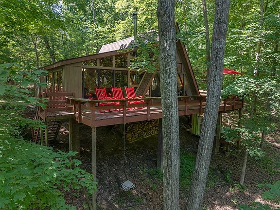 Discover your perfect retreat at 154 Wanderfern Tunnel Pass – an adorable getaway reminiscent of a treehouse nestled among the trees. With an expanded deck overlooking the sprawling 3.45-acre lot, immerse yourself in the tranquility of the meandering creek, majestic oaks, and abundant wildlife. Venture along pathways leading to Bliss Lake for fishing or boating, or explore the community hiking trail leading to the expansive sand beach on Lake Innsbrook. Step inside this picturesque chalet and be greeted by a vast wall of windows, inviting the outdoors in. Watch the game or snuggle by the wood burning stove in the oversized living room. The cozy kitchen beckons with its ample counter space. Retreat to the inviting master bedroom on the main floor. Ascend to the spacious sleeping loft upstairs complete with a half bathroom. Certain furnishings are included. Please note that this property cannot be rented. Experience the magic of Innsbrook and make this stunning retreat your own.