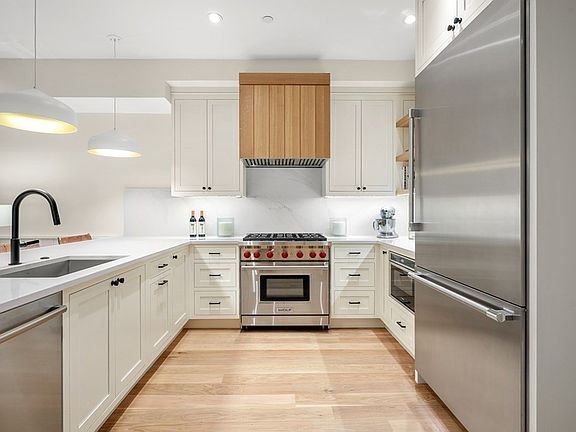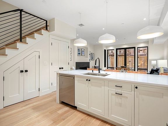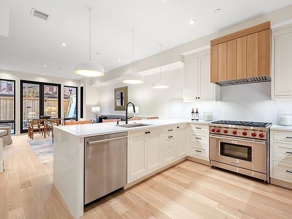 Spectacular new construction three bedroom, three full bathroom garden duplex with two car (tandem) direct access parking. Located in the heart of the South End, just steps to Hayes Park! Open concept kitchen dining and living area leading to a large private garden thru a wall of glass. The custom kitchen with breakfast bar is finished with Quartz counter-tops, Wolf gas range (vented) and Thermador fridge. The open living room has a gas fireplace, high ceilings and wonderful Southern sunlight. Spacious owner's suite with spa like bath and walk-in closet. The bath is finished with a double vanity, oversized shower with glass enclosure and beautiful tile work. The adjacent junior suite is ideal for guests, home office or nursery. Full third bedroom with adjacent full bath make this a special find. Wide plank, white oak hardwood flooring throughout. Electric car charging available.