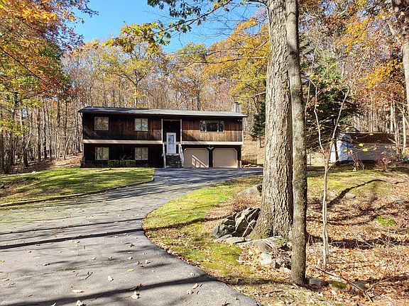 Spacious living on over an acre! Home features a kitchen with highly functional workflow, while dining area and living room are open concept with fantastic exposed beams and brick-faced fireplace. Relax on the back deck and enjoy the peaceful surroundings under the sunsetter awning. You will find three bedrooms & two full baths on the main level. On the spacious lower level is a fourth bedroom and additional full bathroom, as well as a large living area. The paved drive leads to an attached 2-car garage featuring room for vehicles & work bench, while the shed on the property gives additional extra storage. Community with lakes, ball field, playground & swimming pool located minutes to Lake Wallenpaupack, Delaware River, Outlet Shopping & Skiing. Minutes to US6, I84 & I80 for travel.