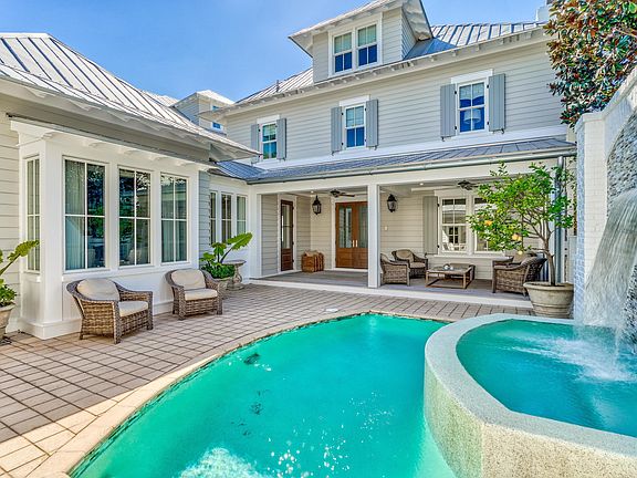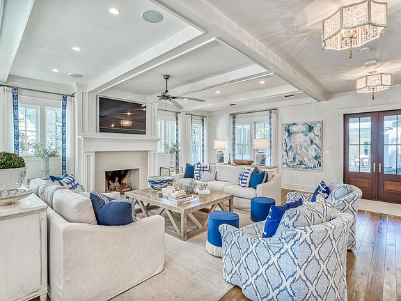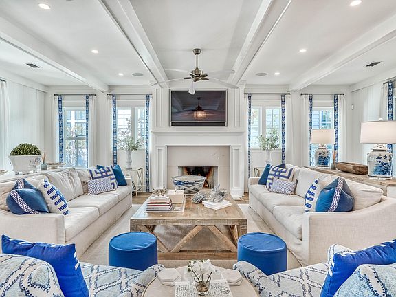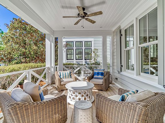 Nestled in WaterColor's Wiregrass Meadows, this immaculate beach home offers a welcoming ambiance with a T.S. Adams Studio Architects design perfect for family gatherings. A charming front porch leads to a spacious kitchen, dining and living area with fireplace, coffered ceilings & gorgeous distressed oak hardwood floors. This residence has been recently updated by Bella Beach including new furnishings, lighting, tile in bathrooms, kitchen countertops & backsplash, freshly painted cabinets, smart home capabilities, new HVAC systems, home security system & much more. The chef's kitchen has a large center island, commercial grade appliances including ice maker, beverage refrigerator & ample storage. The first level also also includes the powder room, built-in office area, custom wine storage
