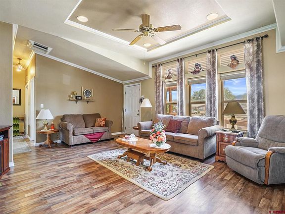 COUNTRY VIEWS INSIDE CITY LIMITS! This beautiful home sits on .521 acres at the end of a cul-de-sac overlooking Hartman Draw Canyon. Plus, has gorgeous views of the Ute Mountains from your dining room table and the Mesa Verdes from your front porch. This large 1,800 sq. ft. home has 4 bedrooms and 2 baths (or 3 beds and an office for those who work from home) built in 2000. Off the West side of the home has an attached one car garage with shelving which could be used as a workshop and a 70' RV parking spot. The front deck overlooks the beautifully landscaped front yard with a drip line installed to the shrubbery making watering more convenient and efficient. From the back porch enjoy the noises of nature from the birds chirping to the sound of the waterfall. The backyard has been well designed with low maintenance in mind as a majority of the yard is xeriscape. The backyard has nice chain link fencing around it plus an extra area for your 4-legged friends giving them plenty of room to run.