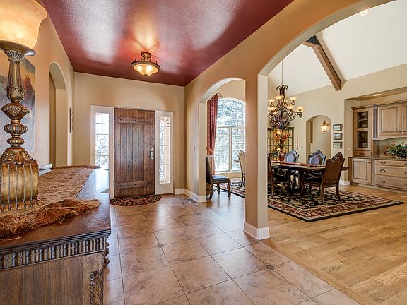 Stunning home w/ flexible floorplan & incredible outdoor living spaces that include 5 decks/patios. The primary patio, ideal for entertaining, measures 34 X 24 & has a firepit & wall fountain. Close to downtown & D-12 Schools, the home has exceptional quality to include beamed ceilings, wide plank hardwood floors, Pella windows & a parklike setting. An impressive entrance hall w/tiled floors & French doors opens to a partially covered deck. Main level guest suite w/walk-in closet, deck access & a private bath w/heated tub.