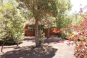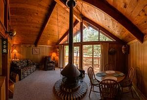 Tall pines & greenery accent this log home. This is YOUR ''cabin in the woods''. Kitchen is open to living/dining area. New bath downstairs features tile shower A Frame w/bump outs - 1 for master bedroom another for enclosed porch which gives additional 9 x 12 living space. Upstairs: 2 sleeping areas upstairs with 1/2 bath - no closets. Triangle shaped lot gives lots of space for garage and for enjoying the outdoors. Front deck recently repaired & painted. Rim Rd gives quick access to enjoying the lakes skiing and biking/hiking trails. Come see your getaway place!