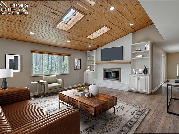Nestled on a private 0.64-acre wooded lot surrounded by towering ponderosa pines, this 5-bedroom, 3-bath two-story home is vacant, refreshed, and move-in ready. Vaulted tongue-and-groove pine ceilings and a striking brick fireplace with built-in shelving create an inviting Colorado mountain atmosphere. Recent updates include brand-new carpet throughout, new roof, and freshly stained 1,000+ sq ft redwood decking. The remodeled kitchen showcases white shaker cabinetry, concrete countertops, stainless appliances, and travertine-style tile flooring, flowing seamlessly into the dining area. The primary suite offers a private deck for morning coffee among the trees, walk-in closets, and en-suite bath with dual vanities and tiled shower. Main-level bedroom and laundry add everyday convenience. Over 1,000 sq ft of multi-level redwood decking wraps the home—ideal for entertaining, grilling, or watching kids explore the expansive wooded yard. The finished basement (1,000+ sq ft) delivers exceptional flexibility with a spacious family room featuring luxury vinyl plank flooring, private office with window and closet (perfect for remote work), guest bedroom, and full bath. Located minutes from Monument's top-rated Lewis-Palmer District 38 schools, shopping, dining, and I-25 access. This peaceful, private retreat delivers true Colorado living with unbeatable convenience. VACANT, move-in ready, easy to show—don't miss this opportunity with exceptional seller incentives!