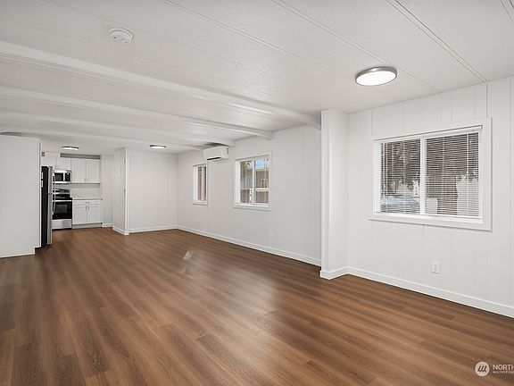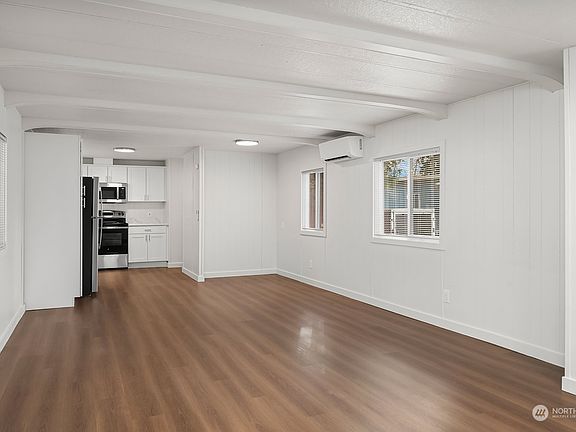 Immerse yourself in the peaceful atmosphere of Horseshoe Acres, a charming 55+ community nestled beside the tranquil river. This 2 bed/2 bath mobile home has been recently remodeled, featuring exquisite quartz countertops, stainless steel appliances, stylish luxury vinyl flooring, new double-pane windows, like-new washer and dryer, and a spacious, upgraded interior. Step outside onto the covered deck, ideal for unwinding, or utilize the secure storage shed, perfect for storing gardening equipment or creating a cozy workshop area. Enjoy the surrounding nature with beautiful rose bushes, blueberry shrubs, and cherry trees all around the community. Close to downtown Kent, public transportation, and several shops and restaurants.