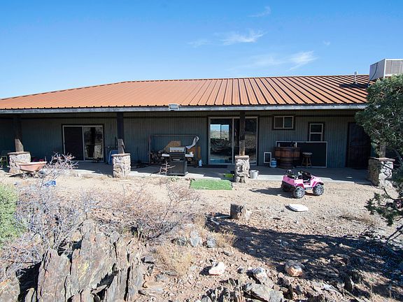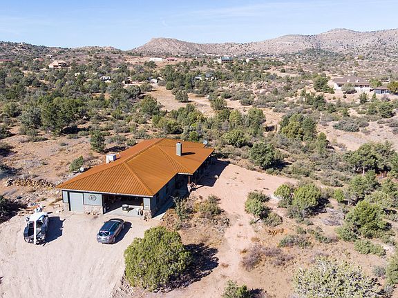 Beautiful Custom built home. Stained and cut concrete flooring throughout. Stained Concrete counters. Huge windows to see the views with all Low E window. AMAZING views from the hilltop. 2 master bedrooms both with Access to back porch. Beautiful Wood burning stove. Fully fenced back yard. RV hookups and plenty of parking at bottom of hill. Plenty of room to Have animals on the property. Horses, cows, pigs all welcome. Last house on the street, Remote but still easy access to Chino Valley. Next to a Registered Animal Reserve! Address just recently got zoned to Prescott but closer to Chino Valley.