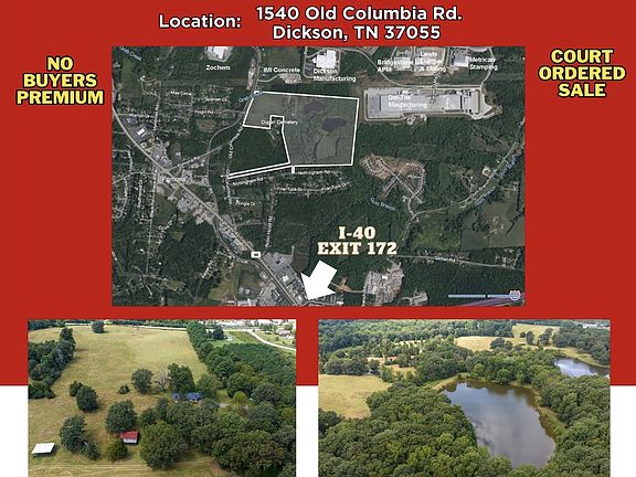 Up for auction is 120+ acres of prime farmland with development potential in the City of Dickson, located 1.6 miles to I-40, exit 172. The property features a 5-acre lake, a 4-acre lake, a large pond, mature oaks, over 2,100' of road frontage, a 70x40' rental shop building, and a 3,000+ sf all-brick home with a partially unfinished basement. There is excellent potential for industrial development, as the property borders the Dickson Co. Industrial Park. This will be sold in two tracts: a 116.83 ac tract and a 6.01 ac tract that is zoned light industrial. This is a court-ordered sale that has no buyer's premium. The sale is subject to court approval. The auction will take place promptly at 10 AM on September 28, 2023.
